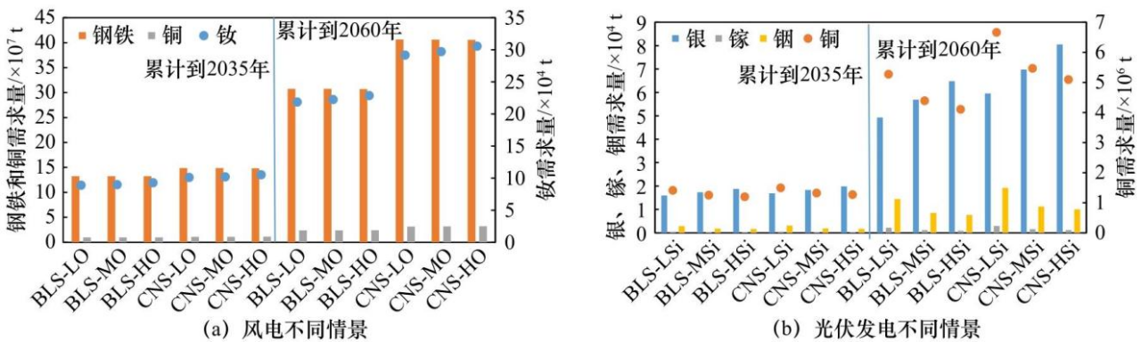圖4 各類方案與主要子技術(shù)的風(fēng)電設(shè)備和光伏組件所需金屬