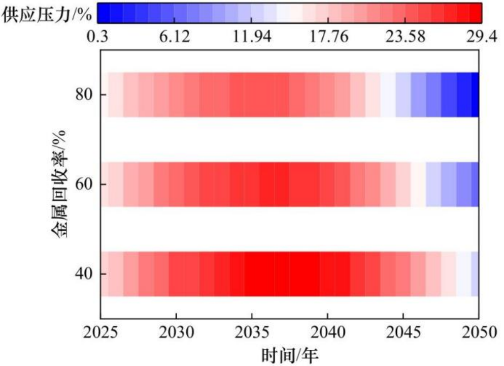 我國新能源產(chǎn)業(yè)發(fā)展需要大量的關(guān)鍵金屬,部分金屬礦產(chǎn)資源依賴進口,增加了供應(yīng)鏈風(fēng)險。改善新能源產(chǎn)業(yè)供應(yīng)鏈的安全性和多樣性,既需要確保金屬礦產(chǎn)資源的可持續(xù)供應(yīng),也需要開展回收循環(huán)和高效利用。以釹為例,不同回收水平情景下的供應(yīng)壓力從最高的50%下降到29%;2050年后,不同回收水平情景下退役設(shè)備中的金屬回收量可逐步覆蓋新能源設(shè)備的金屬需求量。構(gòu)建新能源固廢回收體系至關(guān)重要,將是保障我國關(guān)鍵金屬供應(yīng)的重要路徑。