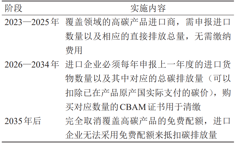歐盟提出CBAM,旨在彌補(bǔ)進(jìn)口產(chǎn)品原產(chǎn)國(guó)與歐盟之間存在的碳價(jià)差異,防止域內(nèi)高碳企業(yè)先向域外轉(zhuǎn)移再回移到內(nèi)部,從而削弱歐盟本土行業(yè)的綜合競(jìng)爭(zhēng)力、碳減排政策成效。CBAM涵蓋鋼鐵、水泥、電力等高碳行業(yè),分為3個(gè)實(shí)施階段來(lái)不斷擴(kuò)大覆蓋面(見(jiàn)表1)。目前,歐盟尚未詳細(xì)規(guī)定產(chǎn)品生產(chǎn)全流程中碳排放量的具體計(jì)算方式、直接排放范圍邊界等,需申報(bào)產(chǎn)品的碳排放量?jī)H限于相關(guān)行業(yè)的生產(chǎn)加工過(guò)程(包括用電碳排放量、生產(chǎn)過(guò)程碳排放量),尚不涉及上 / 下游。直觀上,CBAM主要影響我國(guó)的能源和資源密集型行業(yè),如鋼鐵和鋁行業(yè),此類行業(yè)產(chǎn)品的碳排放主要來(lái)自電力供應(yīng)的傳遞,隨著CBAM覆蓋范圍的逐步擴(kuò)大將面臨較為顯著的碳稅成本壓力;為新能源制造業(yè)及其上 / 下游產(chǎn)業(yè)提供了更好的發(fā)展機(jī)遇。然而,其他制造業(yè)將面臨趨緊的碳排放約束,需要加快推進(jìn)制造業(yè)近零碳化轉(zhuǎn)型,引導(dǎo)國(guó)內(nèi)相關(guān)主體共建綠色制造生態(tài)。