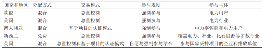 社會(huì)生產(chǎn)綠色轉(zhuǎn)型已成為可持續(xù)發(fā)展的戰(zhàn)略目標(biāo),國(guó)際碳市場(chǎng)規(guī)模持續(xù)擴(kuò)大。已有多個(gè)碳排放權(quán)交易系統(tǒng)正在運(yùn)行,但分配方式、參與規(guī)則、交易品種等存在差異性(見(jiàn)表4)。國(guó)際碳市場(chǎng)的發(fā)展歷程具有共性:市場(chǎng)覆蓋范圍階段性擴(kuò)大,多以電力行業(yè)為基礎(chǔ),逐漸延伸到交通、建筑、化工等高碳排放行業(yè);基本采取碳配額總量控制模式,逐步減少免費(fèi)配額的發(fā)放比例,同步提高拍賣配額的分配比例;通過(guò)監(jiān)測(cè) ? 報(bào)告 ? 核查機(jī)制明確參與各方權(quán)責(zé),碳排放計(jì)量數(shù)據(jù)具有良好的準(zhǔn)確性和可靠性,確保交易合規(guī)性以及參與主體順利履約;涉及金融的碳交易被納入金融監(jiān)管范圍,不履約企業(yè)面臨高額的罰款,以此控制風(fēng)險(xiǎn)和明晰懲罰。