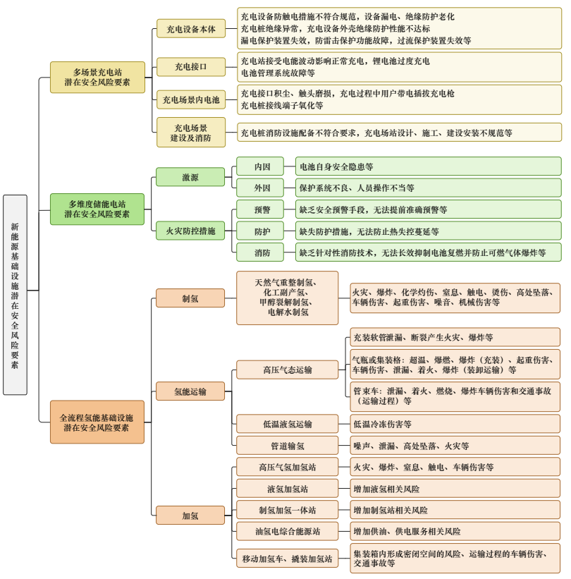 我國新能源基礎(chǔ)設(shè)施加速發(fā)展,但潛在的安全風(fēng)險(xiǎn)尚未充分暴露,加之相應(yīng)外延不斷擴(kuò)大、內(nèi)涵不斷豐富,導(dǎo)致對(duì)風(fēng)險(xiǎn)類型與事故種類的認(rèn)識(shí)仍有不足。儲(chǔ)能、氫能、充電樁、“油氣氫”綜合能源等各類基礎(chǔ)設(shè)施的故障演化機(jī)理尚未明確,事故成因與誘因仍不清晰。在常規(guī)安全、人身安全、設(shè)備安全風(fēng)險(xiǎn)以外,存在系統(tǒng)安全、運(yùn)行安全、環(huán)境安全、網(wǎng)絡(luò)與信息安全等風(fēng)險(xiǎn)。因?qū)ξ磥砜深A(yù)見的安全風(fēng)險(xiǎn)、未預(yù)見的潛在安全風(fēng)險(xiǎn)缺乏清晰認(rèn)知,新能源基礎(chǔ)設(shè)施的發(fā)展形態(tài)與路徑研究有待深化,新材料、新產(chǎn)品、新業(yè)態(tài)伴生的安全風(fēng)險(xiǎn)也需加強(qiáng)研判,安全監(jiān)管持續(xù)面臨著新增挑戰(zhàn)與更高要求。