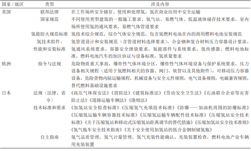 發(fā)達(dá)國家和地區(qū)關(guān)注并重視氫能基礎(chǔ)設(shè)施安全管理方面的法規(guī)及標(biāo)準(zhǔn)(見表2)。① 美國通過法律、法規(guī)、標(biāo)準(zhǔn)來保障氫能安全管理,采用了三層結(jié)構(gòu):頂層由國家法律、建筑與消防法規(guī)組成;中間層是在法律法規(guī)中引用的強(qiáng)制性標(biāo)準(zhǔn),使相關(guān)標(biāo)準(zhǔn)也具有法律效力;基礎(chǔ)層是中間層文件進(jìn)行引用的標(biāo)準(zhǔn)內(nèi)容。② 歐洲的氫能監(jiān)管層次結(jié)構(gòu)與美國類似,具有金字塔式的結(jié)構(gòu)特征,從上到下依次為法律法規(guī)、標(biāo)準(zhǔn)、指導(dǎo)性技術(shù)文件。③ 日本設(shè)立了經(jīng)濟(jì)產(chǎn)業(yè)省節(jié)能與新能源部新能源系統(tǒng)課氫與燃料電池戰(zhàn)略室,以此為氫能主管部門;采取“只要?dú)錃獠恍孤?,就不?huì)發(fā)生著火爆炸事故”的監(jiān)管理念,嚴(yán)格執(zhí)行《高壓氣體保安法》,在氫能使用過程中根據(jù)實(shí)際情況采取必要的安全技術(shù)措施。
