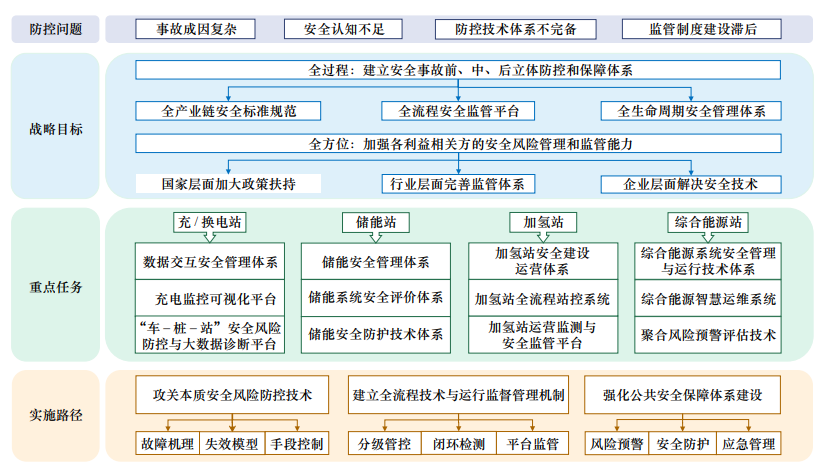 借鑒相關(guān)研究成果和國家發(fā)展規(guī)劃目標(biāo),文章提出建立新能源應(yīng)用安全事故前、中、后立體防控與保障體系,加強(qiáng)各利益相關(guān)方的安全風(fēng)險(xiǎn)管理與監(jiān)管能力兩大防控目標(biāo),合理降低安全問題對(duì)新能源基礎(chǔ)設(shè)施健康發(fā)展的影響和束縛,促進(jìn)新能源應(yīng)用的安全有序發(fā)展。