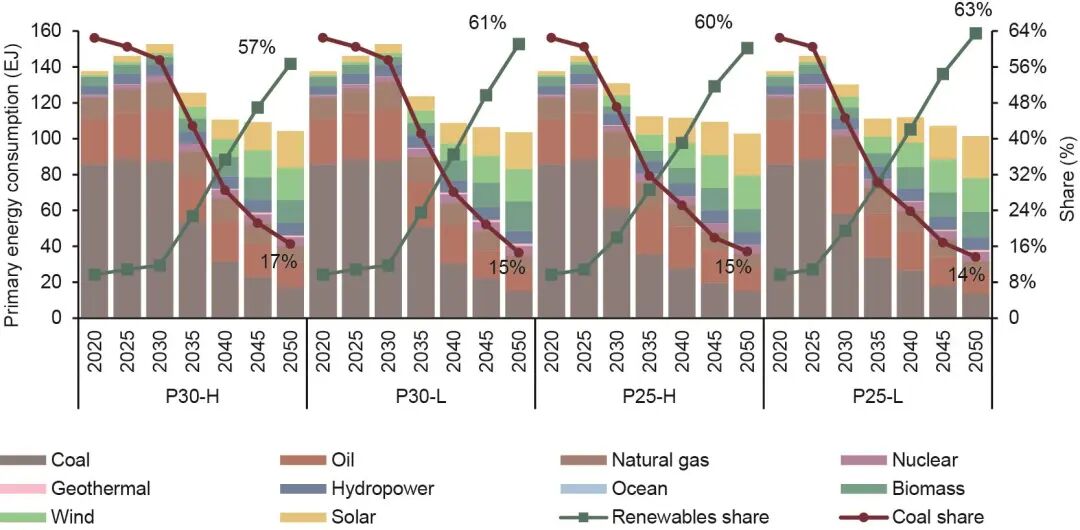 相比之下,可再生能源目前占一次能源消費(fèi)的10%,同時(shí)增長緩慢,主要是為了滿足增量能源需求。未來,可再生能源將最有希望填補(bǔ)由煤炭消費(fèi)下降造成的缺口,從而逐步取代化石燃料。據(jù)測(cè)算,在2035—2040年,可再生能源將超越化石燃料,成為中國最主要的能源。到2050年,中國一次能源消費(fèi)中可再生能源比重將達(dá)到約60%。同樣,對(duì)于2050年碳預(yù)算較低或者開始減排較早的情景(P25-L、P25-H和P30-L),可再生能源的占比將更高。