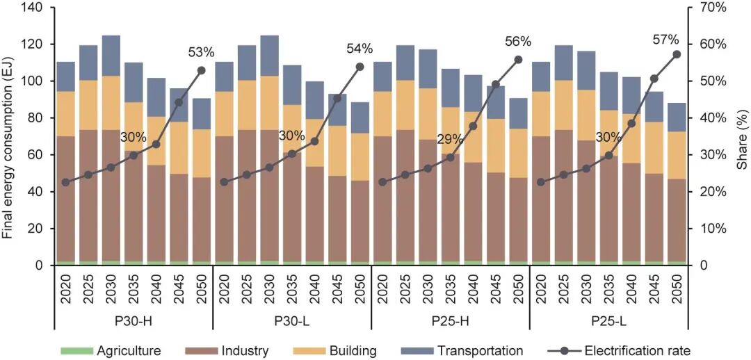 圖5. 分部門終端能源消費(fèi)及電氣化率。