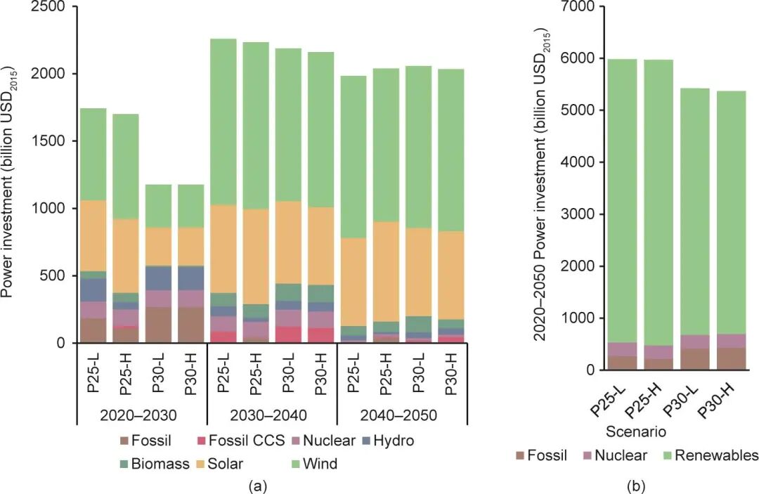 圖9. 電力部門不同技術(shù)投資(a)和2020—2050年電力部門總投資(b)。USD2015表示采用2015年美元不變價(jià),并且按照2015年官方公布的匯率將人民幣轉(zhuǎn)換為美元進(jìn)行統(tǒng)計(jì)。