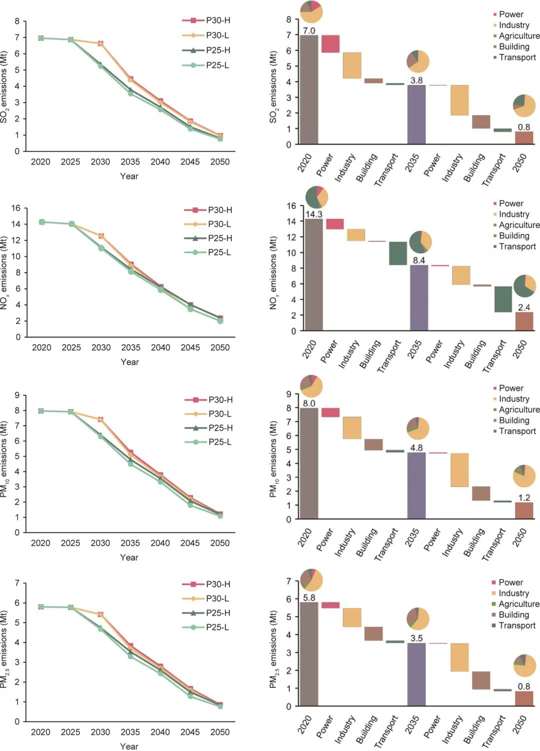 圖10. CO2減排對(duì)局地空氣污染物治理的協(xié)同效應(yīng)(左)和P25-H情景下,2020—2035年和2035—2050年兩段時(shí)期,各部門對(duì)于局地空氣污染物減排的貢獻(xiàn)分解(右)。