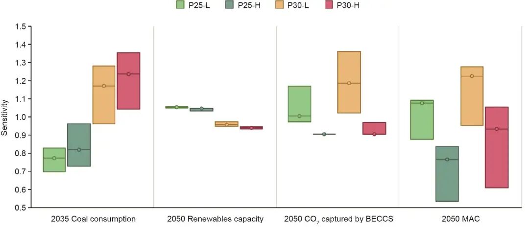 圖11. 2035年煤炭消費(fèi)、2050年可再生能源裝機(jī)容量、2050年BECCS產(chǎn)生的負(fù)排放和2050年邊際減排成本的靈敏性分析。在固定峰值水平、達(dá)峰時(shí)間和2050年排放水平的情況下,2011—2050年每個(gè)靈敏性情景下累計(jì)排放增加或減少5%。根據(jù)基礎(chǔ)情景的平均值對(duì)結(jié)果進(jìn)行歸一化處理。箱型圖中的空心點(diǎn)代表了基礎(chǔ)情景下的數(shù)值。