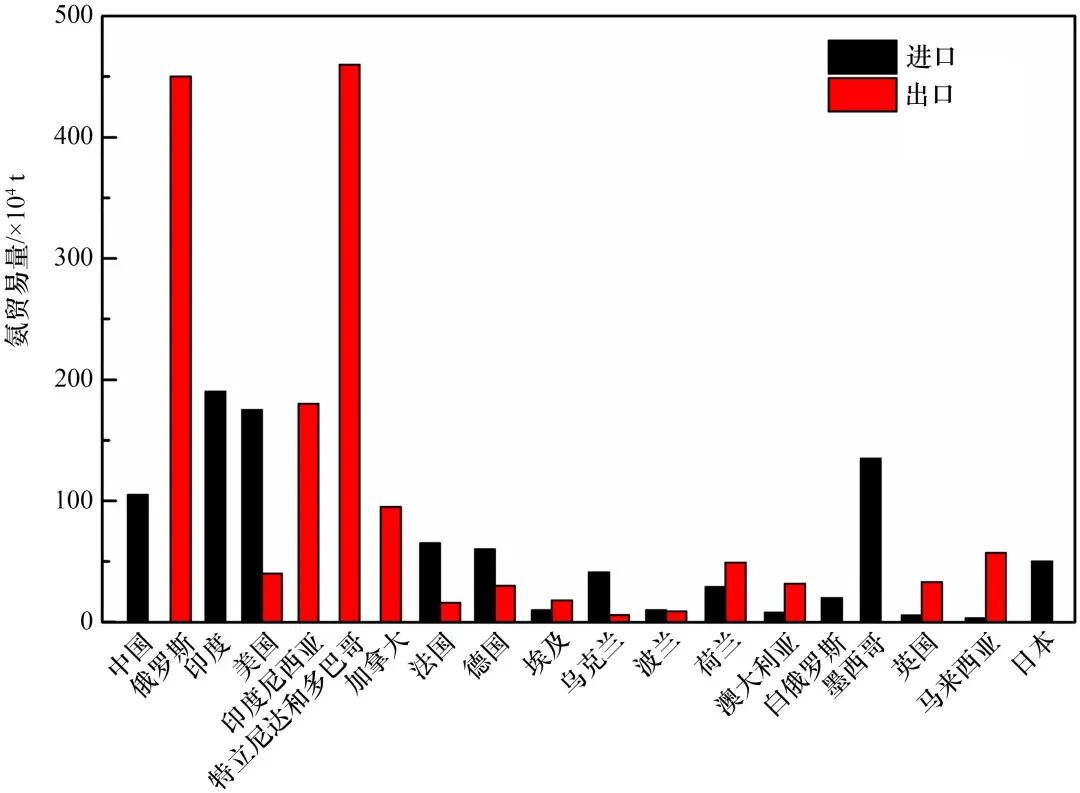 目前,合成氨的生產(chǎn)過程還未實現(xiàn)綠色?;趥鹘y(tǒng)的合成工藝,全球每年合成氨產(chǎn)量為2×108 t左右,主要產(chǎn)自四個國家:中國、印度、俄羅斯和美國,并在全球范圍內(nèi)進行貿(mào)易。中國和印度雖然合成氨產(chǎn)量巨大,但也是氨的主要進口國,而俄羅斯則是主要的出口國,約70%合成氨(約1.7×108 t)用于出口(見圖3)。