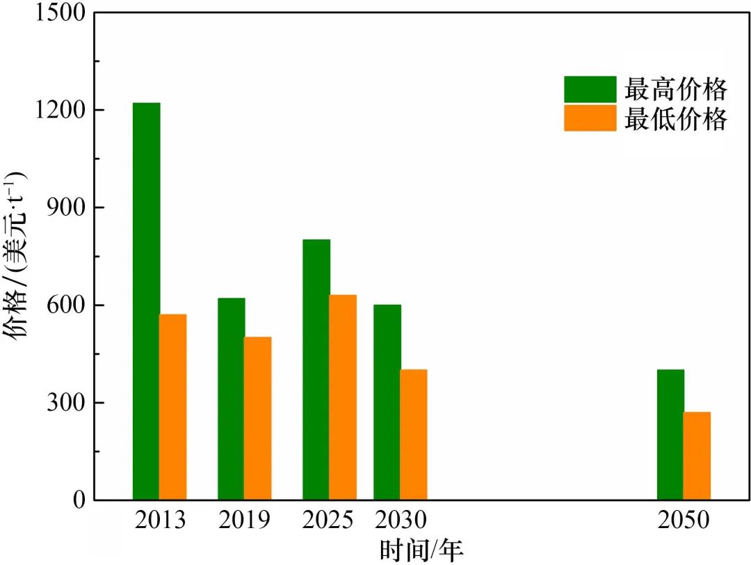 在可再生資源最好的地區(qū),綠氨的成本估計為689 美元/t,高于灰氨的價格(225 美元/t)。據(jù)預測,到2030年綠氨價格將降至464 美元/t,到2050年將降至295 美元/t(見圖6)。當碳價格為127 美元/t左右時,綠氨就能與現(xiàn)有的化石合成氨生產(chǎn)相競爭。2030年后,綠氨預計將通過碳捕集實現(xiàn)與灰氨的合成成本持平,這也讓用氨的下游化工企業(yè)更有動力使用綠氨代替灰氨作為原材料。綠氨液化后的單位體積能量密度雖然不及傳統(tǒng)的化石能源,但高于綠氫。尤為重要的是綠氨的液化和運輸產(chǎn)生的成本遠低于綠氫。從“制 ? 儲 ? 輸 ? 用”全生命周期成本來看,綠氨的成本低于綠氫。由此可以預見,未來綠氨會在能源領域大量使用,而化工領域也會同時實現(xiàn)綠氨對傳統(tǒng)合成氨工業(yè)的替代。目前全球多個大型綠氫綠氨項目正在推進,預測到2030年,全球宣布的綠氨項目年生產(chǎn)能力為1.5×107 t(54個項目,產(chǎn)能是當前氨市場的8%),我國綠氨規(guī)劃并落地的年產(chǎn)能已超過1.56×106 t。