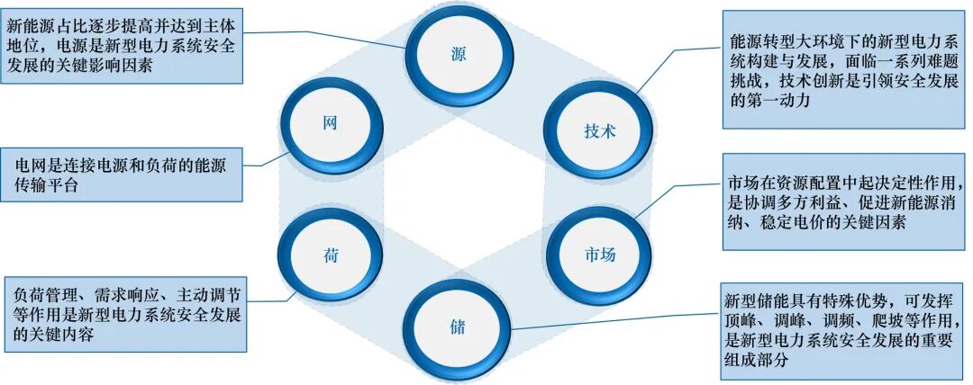 新型電力系統(tǒng)是實(shí)現(xiàn)“雙碳”目標(biāo)、重塑能源安全格局的重要載體,構(gòu)建新型電力系統(tǒng)是提高能源安全韌性的根本性舉措。新型電力系統(tǒng)的安全發(fā)展主要受到源、網(wǎng)、荷、儲、市場、技術(shù)六大因素的綜合影響(見圖1)。