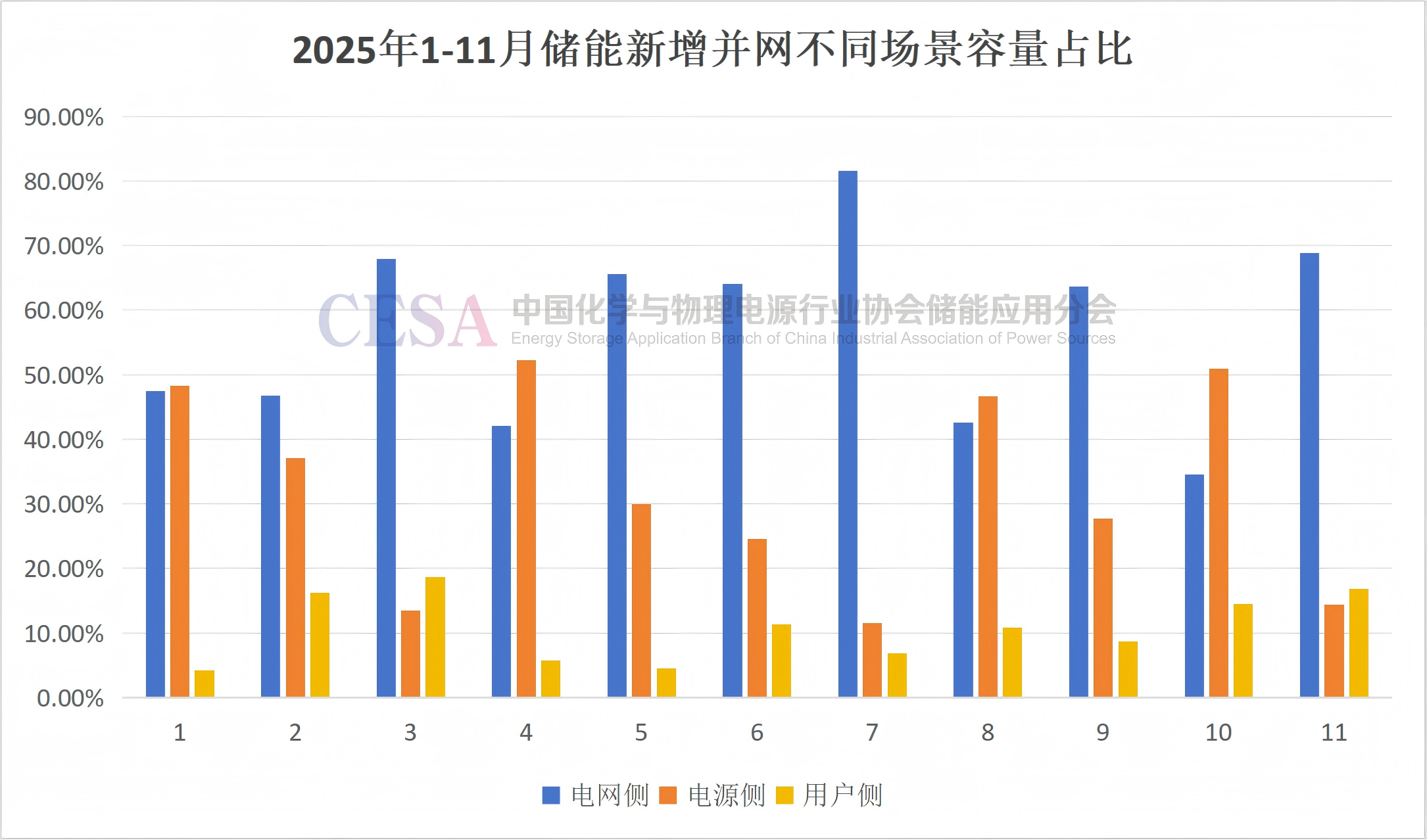 按月份來看,增長勢頭更為清晰。前11個月中,獨(dú)立儲能在3月、5月、6月、7月、9月、11月等六個月份占比均超過60%。