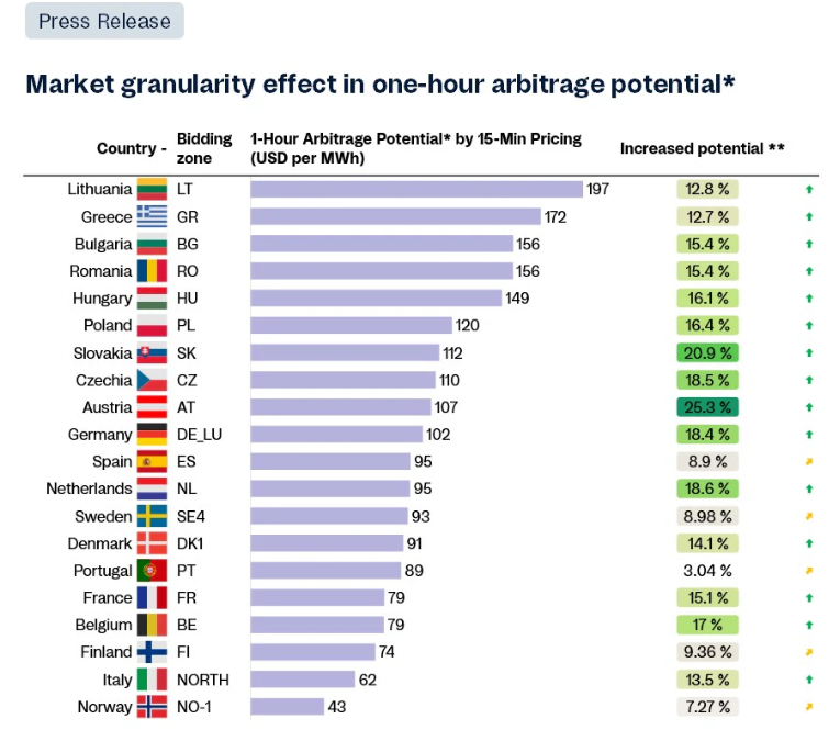 10月,當歐洲的一天電力市場從每小時一小時切換到15分鐘MTUs時,在立陶宛,15分鐘內(nèi)的能量轉(zhuǎn)換能賺取約263美元每兆瓦時(MWh),比小時交易高出14%。在德國,15分鐘套利比小時套利高16%。