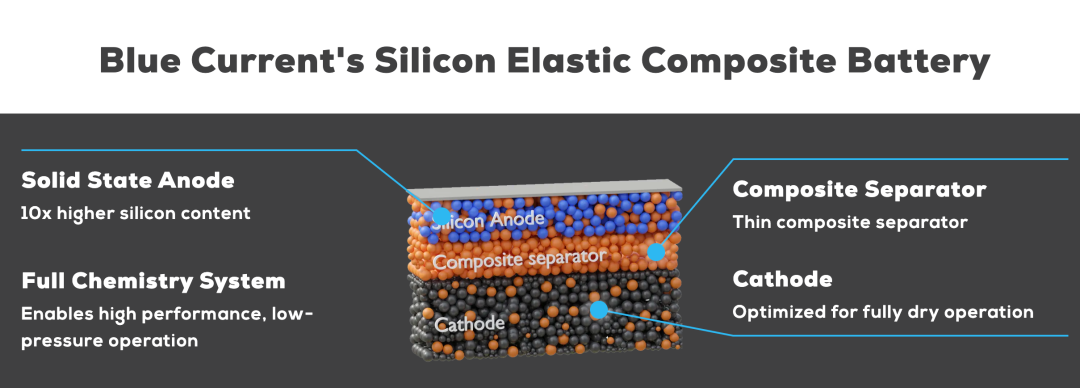 Blue Current 的技術(shù)核心在于“硅+全干型電解質(zhì)”。公司采用地球資源豐富的硅材料與彈性聚合物負(fù)極,配合無液態(tài)溶劑的全干電解質(zhì),構(gòu)建兼具高能量密度與安全性的固態(tài)體系。