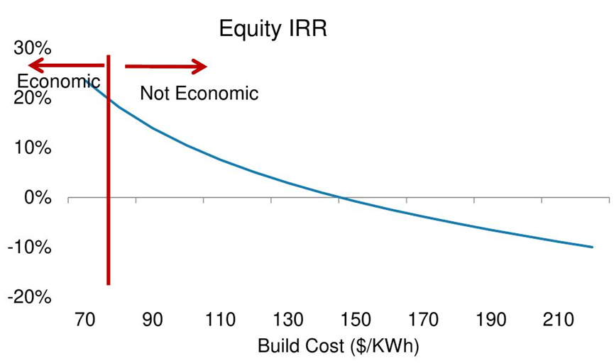 假設(shè)當(dāng)前美國儲能系統(tǒng)建設(shè)成本為250美元/kWh的情況下,總投資采用50%的負(fù)債率,在慢衰減和快衰減情景下,權(quán)益IRR分別可達(dá)38%和27%,整整差了11個百分點。