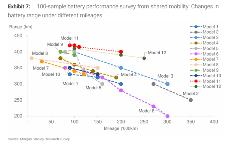 摩根士丹利的研報中,披露了其關(guān)于電池性能的調(diào)研,報告中展示寧德時代CATL對電池衰減的控制能力最強(qiáng)。
