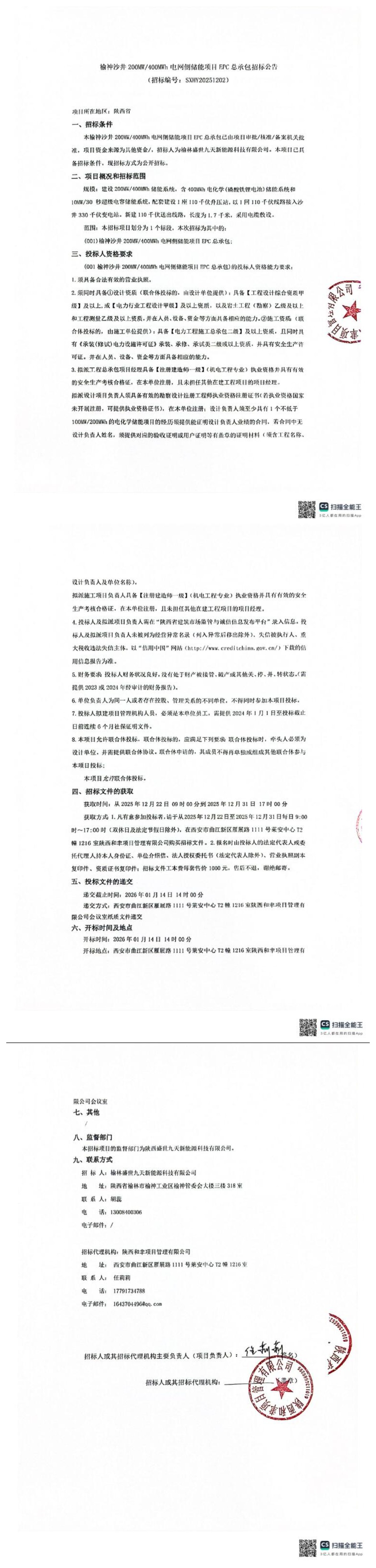 中國(guó)儲(chǔ)能網(wǎng)訊:12月22日,榆神沙井200MW/400MWh電網(wǎng)側(cè)儲(chǔ)能項(xiàng)目EPC總承包招標(biāo)公告發(fā)布。