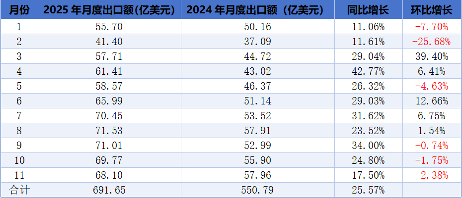 表一2025年1-11月鋰離子電池出口量月度變化情況
