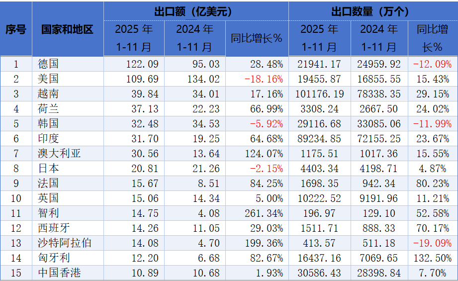 德國(guó)從5月份開(kāi)始已經(jīng)取代美國(guó)成為我國(guó)鋰離子電池第一大出口市場(chǎng),2025年1-11月出口金額為122.09億美元,同比增長(zhǎng)28.48%,占我國(guó)鋰離子出口總額的17.7%。第二大市場(chǎng)為美國(guó),1-11月出口總金額為109.69億美元,同比下降18.16%,占我國(guó)鋰離子電池出口額的15.9%。越南為第三大出口市場(chǎng),出口金額為35.84億美元,同比增長(zhǎng)17.16%,占我國(guó)鋰離子電池出口額的5.2%。前十大出口國(guó)家中,同比增幅最大的國(guó)家分別為智利、沙特阿拉伯、澳大利亞。