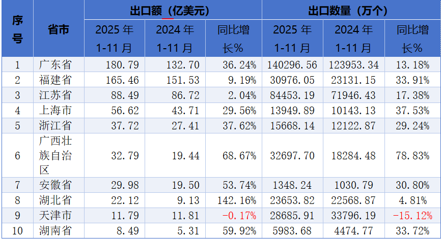 2025年1-11月前十大出口地,其中金額增幅最大的三個(gè)省分別是湖北省、廣西壯族自治區(qū)、湖南省,出口額分別增長(zhǎng)142.16%、68.67%、59.92%。出口數(shù)量增幅最大的三個(gè)省市分別為廣西壯族自治區(qū)、上海市、福建省,出口數(shù)量分別增長(zhǎng)了78.83%、37.53%、33.91%。