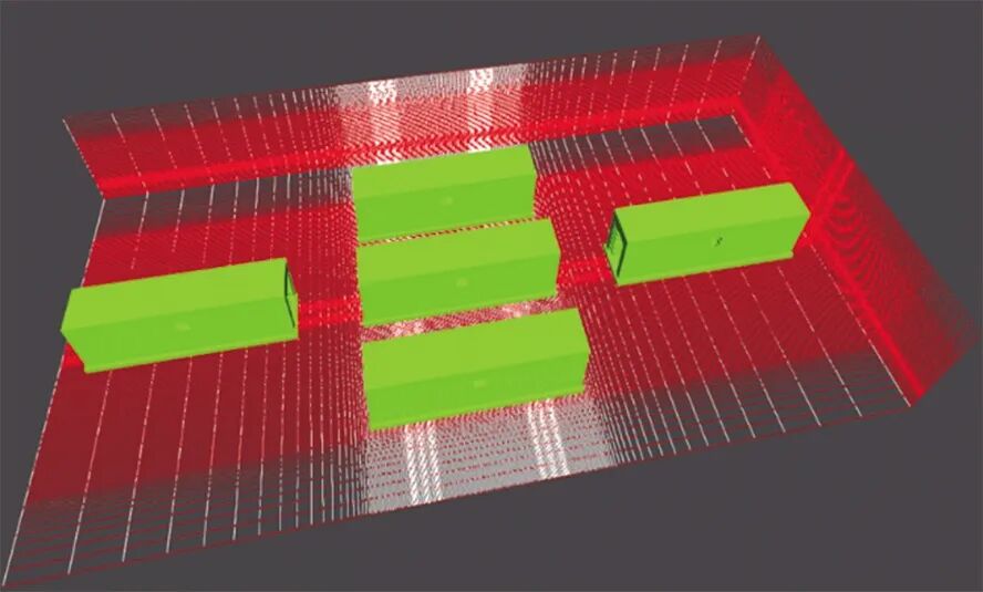 本工作采用1∶1的比例對磷酸鐵鋰電池儲能預(yù)制艙的幾何空間進行建模,圖1(a)為預(yù)制艙式儲能磷酸鐵鋰電池電站的整體布局,主要電氣設(shè)備為5個功率/容量為1.26 MW/2.2 MWh的磷酸鐵鋰電池預(yù)制艙。為研究各方向上的爆炸后果,5個儲能艙呈“十字形”排列,每兩個儲能艙之間較長邊相隔距離為3 m,較短邊相隔距離為4 m。