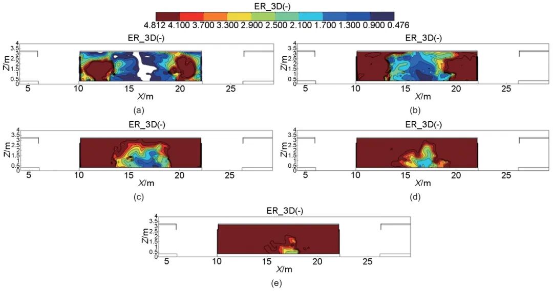 圖5 儲能電站熱失控氣體擴散可燃極限范圍-XZ截面:(a) ?t=2 s,t=2 s;(b) ?t=3 s,t=3 s;(c) ?t=4 s,t=4 s;(d) ?t=5 s,t=5 s;(e) ?t=6 s,t=6 s