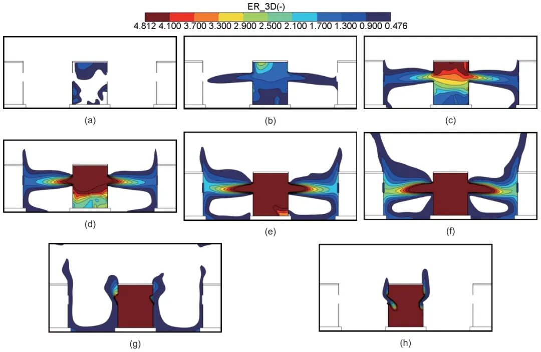 圖6 儲能電站熱失控氣體擴散可燃極限范圍-YZ截面:(a) ?t=2 s,t=2 s;(b) ?t=3 s,t=3 s;(c) ?t=4 s,t=4 s;(d) ?t=5 s,t=5 s;(e) ?t=7 s,t=7 s;(f) ?t=9 s,t=9 s;(g) ?t=10 s,t=11 s;(h) ?t=10 s,t=16 s