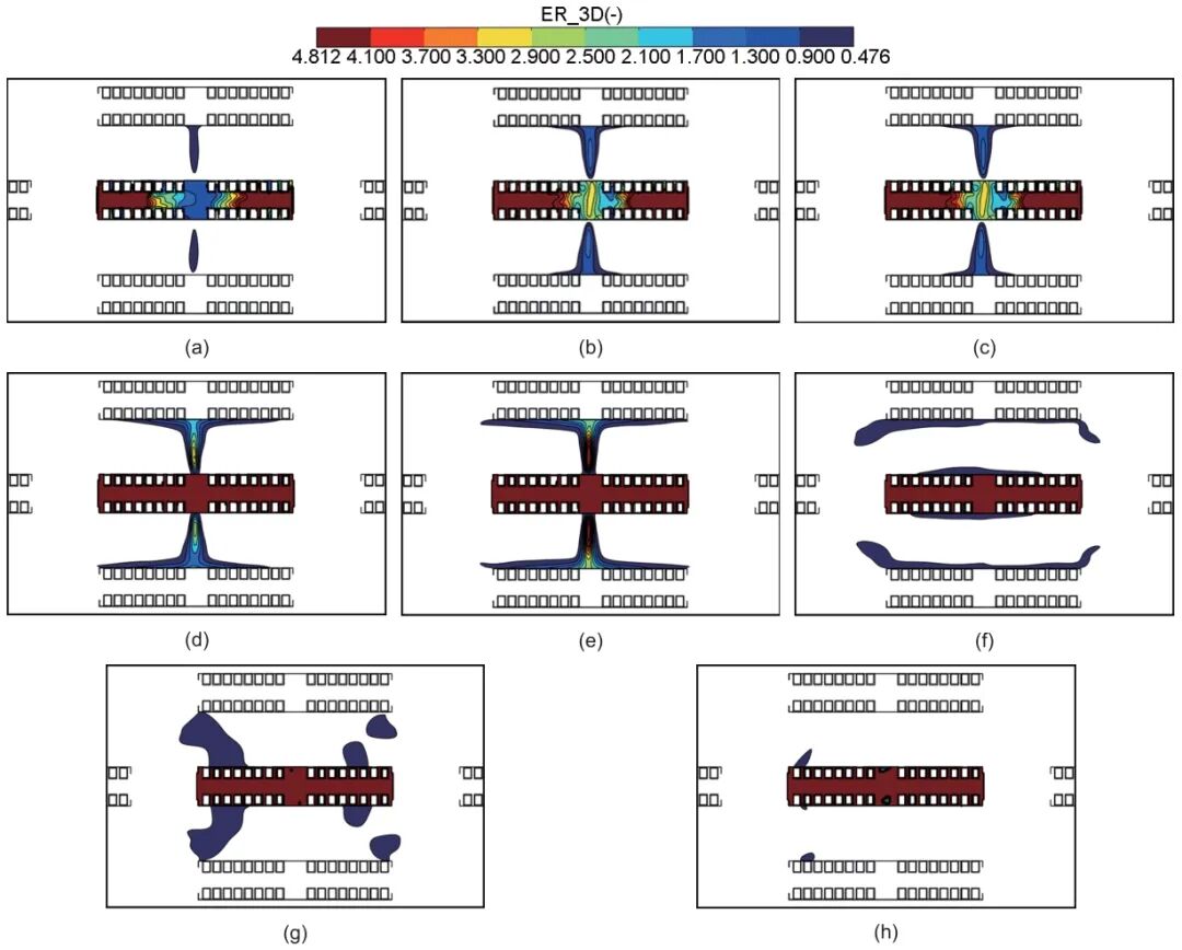 圖7 儲能電站熱失控氣體擴散可燃極限范圍-XY截面:(a) ?t=3 s,t=3 s;(b) ?t=4 s,t=4 s;(c) ?t=5 s,t=5 s;(d) ?t=7 s,t=7 s;(e) ?t=9 s,t=9 s;(f) ?t=10 s,t=11 s;(g) ?t=10 s,t=13 s;(h) ?t=10 s,t=15 s