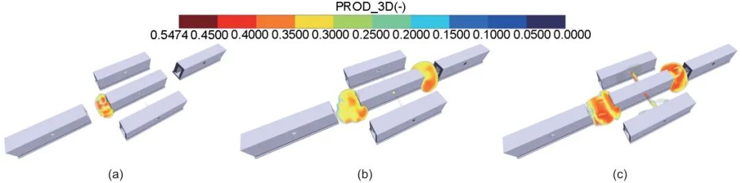 圖8 儲能電站泄漏前期爆炸火焰形態(tài)特征:(a) ?t=1 s,t=1 s;(b) ?t=2 s,t=2 s;(c) ?t=3 s,t=3 s
