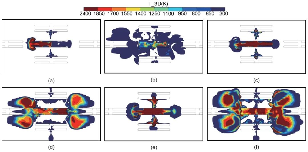 圖10 儲能艙熱失控氣體泄漏不同時期爆炸溫度變化:(a) ?t=1 s,爆炸前期;(b) ?t=1 s,爆炸結(jié)束;(c) ?t=2 s,爆炸前期;(d) ?t=2 s,爆炸結(jié)束;(e) ?t=3 s,爆炸前期;(f) ?t=3 s,爆炸結(jié)束