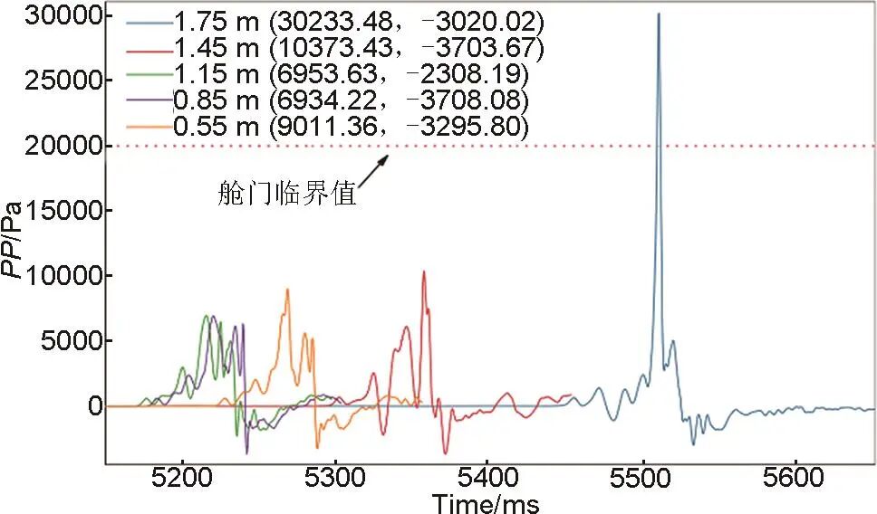 圖12 不同高度點火源對相鄰儲能艙艙門壓力的影響