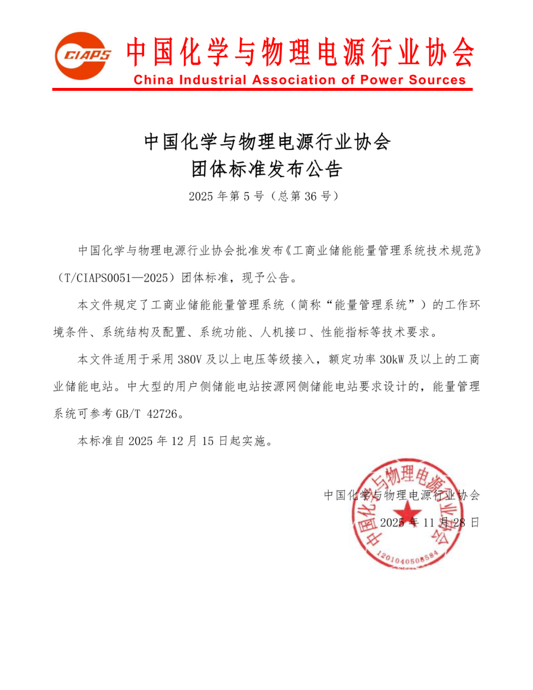 中國(guó)化學(xué)與物理電源行業(yè)協(xié)會(huì)批準(zhǔn)發(fā)布《工商業(yè)儲(chǔ)能能量管理系統(tǒng)技術(shù)規(guī)范》(T/CIAPS0051—2025)團(tuán)體標(biāo)準(zhǔn),現(xiàn)予公告。
