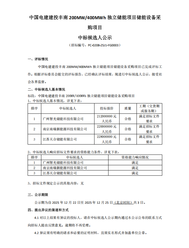 中國儲(chǔ)能網(wǎng)訊:12月22日,中國電建發(fā)布建投豐南200MW/400MWh獨(dú)立儲(chǔ)能項(xiàng)目儲(chǔ)能設(shè)備采購項(xiàng)目中標(biāo)候選人公示。根據(jù)公示,廣州智光儲(chǔ)能科技有限公司以投標(biāo)報(bào)價(jià)2.12億元(折合單價(jià)約0.53元/Wh)預(yù)中標(biāo)。