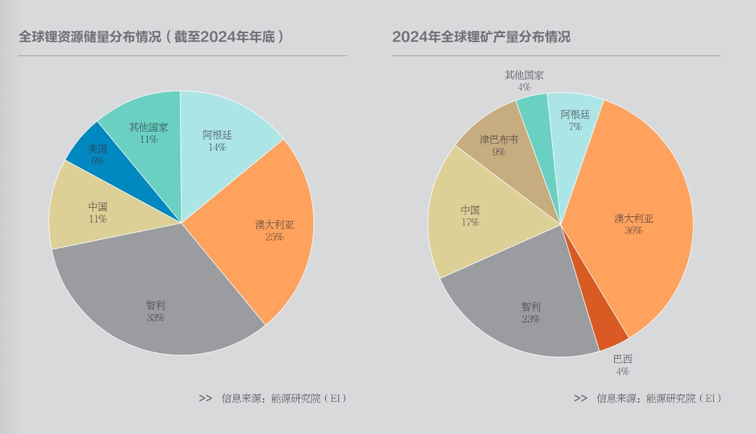 鋰資源在全球分布相對(duì)集中,南美洲的“鋰三角”(智利、玻利維亞和阿根廷)、中國、澳大利亞和美國等國家的鋰資源儲(chǔ)量占全球鋰資源總量的90%。根據(jù)行業(yè)研究機(jī)構(gòu)能源研究院(Energy Institute)的統(tǒng)計(jì),截至2024年底,全球鋰儲(chǔ)量約為2810.76萬噸,智利、澳大利亞和阿根廷的儲(chǔ)量位列前三。