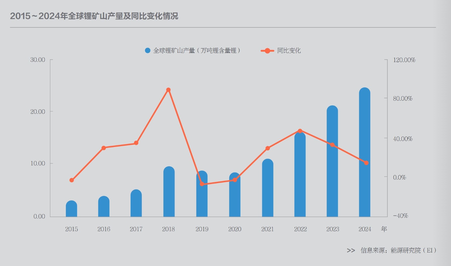 受近年來全球能源轉(zhuǎn)型的驅(qū)動(dòng),市場電動(dòng)車和儲(chǔ)能需求大幅增加,并拉動(dòng)了全球鋰資源(及下游)投資和供應(yīng)需求。鋰礦山的產(chǎn)量從2015年的2.95萬噸增加至2024年的24.46萬噸,年復(fù)合增長率超過25%。澳大利亞是全球最大的鋰資源供應(yīng)國,2024年,該國鋰礦山的產(chǎn)量約為8.8萬噸,占全球鋰資源供應(yīng)的三分之一以上。智利和我國分列第二和第三位,占比分別為23%和17%。前三大供應(yīng)國占據(jù)了全球鋰供應(yīng)總量四分之三以上。此外,2024年鋰資源供應(yīng)增長的主要來源包括阿根廷和津巴布韋等新興生產(chǎn)國,鋰資源供應(yīng)呈現(xiàn)出多元化的趨勢。