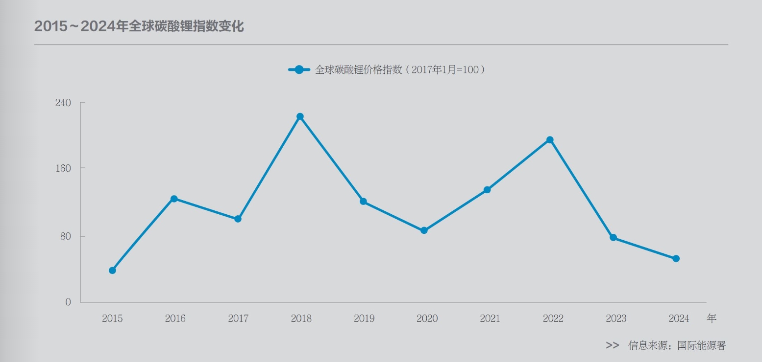 從價(jià)格變化看,主要含鋰元素的礦物鋰輝石在2024年的價(jià)格大致保持穩(wěn)定,而鋰化學(xué)品價(jià)格則持續(xù)下滑。這是由新能源汽車需求增速放緩、儲(chǔ)能市場增長不及預(yù)期以及消費(fèi)電子需求疲軟等因素疊加所導(dǎo)致。其中,2024年全球新能源汽車銷量同比增長約30%,增速較2023年明顯放緩,這是因?yàn)橹饕袌鐾瞥鲅a(bǔ)貼退坡政策,導(dǎo)致消費(fèi)者購車意愿下降。儲(chǔ)能電池對(duì)鋰的需求增速低于預(yù)期,主要原因是光伏發(fā)電、風(fēng)電等可再生能源裝機(jī)增速放緩,以及儲(chǔ)能項(xiàng)目審批周期延長。2024年,全球儲(chǔ)能鋰電池出貨量同比增長約25%,低于行業(yè)預(yù)期的40%。智能手機(jī)、筆記本電腦等消費(fèi)電子產(chǎn)品銷量下滑,進(jìn)一步抑制了對(duì)鋰的需求。