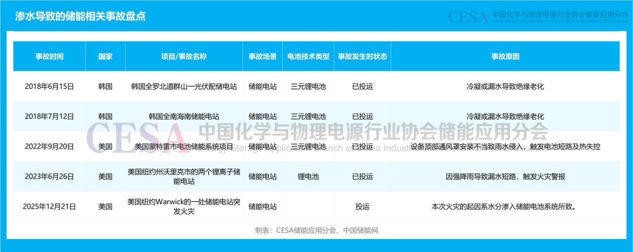 回顧近年來的事故案例,水的威脅以多種形式滲透到儲能系統(tǒng)中。2022年,美國蒙特雷市一個儲能項目因設(shè)備頂部通風(fēng)罩安裝不當(dāng),致雨水侵入觸發(fā)電池短路及熱失控;同年,加州一個項目在調(diào)試期間起火,調(diào)查發(fā)現(xiàn)電池艙內(nèi)存在冷凝水積聚跡象。2023年,紐約州沃里克市的兩個儲能電站因強降雨導(dǎo)致漏水短路,引發(fā)火災(zāi)警報。更早的2018年,韓國全羅北道和全南海南的儲能電站均因冷凝或漏水導(dǎo)致絕緣老化。