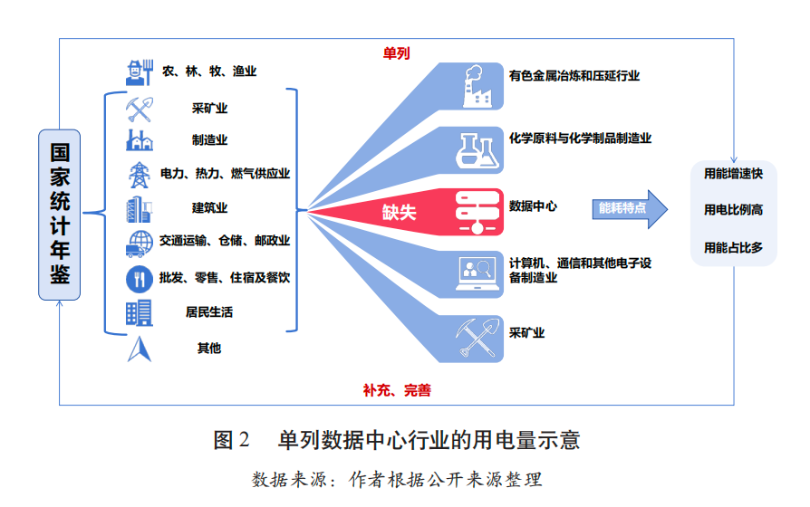 一方面,要進一步提高各行業(yè)對數(shù)據(jù)中心用電統(tǒng)計的重視程度,因此,建議對照《國民經(jīng)濟行業(yè)分類與代碼》的分類,對數(shù)據(jù)中心相關(guān)行業(yè)進行電力消費的統(tǒng)計。需要說明的是,數(shù)據(jù)中心的電力消費不屬于計算機、通信和其他電子設(shè)備制造業(yè),而是與多類別行業(yè)的電力消費相關(guān),特別是《國民經(jīng)濟行業(yè)分類與代碼》中的“信息處理和存儲支持服務”“其它電信服務”行業(yè)。因此,如圖2所示,建議在《中國統(tǒng)計年鑒》的“分行業(yè)能源消費總量”中單列“數(shù)據(jù)中心基礎(chǔ)設(shè)施行業(yè)”的能耗。數(shù)據(jù)中心具有綠電消費需求強、水耗大的特點,建議在現(xiàn)有能耗計量的基礎(chǔ)上,強化數(shù)據(jù)中心綠電消費、電力利用率和水耗的統(tǒng)計,以便更好地優(yōu)化數(shù)據(jù)中心的能源使用。另一方面,統(tǒng)計對象除傳統(tǒng)的數(shù)據(jù)中心設(shè)施外,還應包括云計算平臺、邊緣計算節(jié)點等新興業(yè)態(tài)的電力消耗。同時,目前數(shù)據(jù)中心主要分為通用、智算、超算三類,具體分為大型、中型、小型,因此統(tǒng)計范圍需覆蓋從服務器、存儲系統(tǒng)到制冷設(shè)備、供配電系統(tǒng)等各個環(huán)節(jié)、各種類型、各種規(guī)模數(shù)據(jù)中心的用電情況,以確保全方位掌握數(shù)據(jù)中心的整體能耗,為制定科學合理的節(jié)能減排政策提供數(shù)據(jù)支持,推動數(shù)據(jù)中心行業(yè)向綠色低碳、高效可持續(xù)的方向發(fā)展。