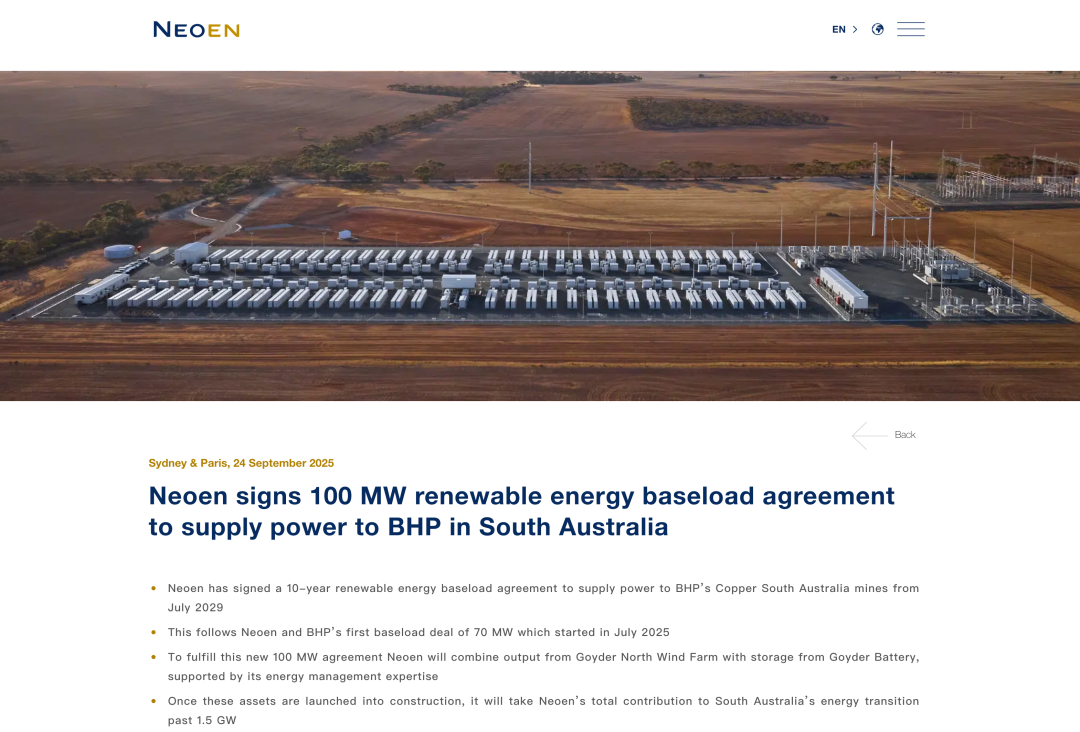 Neoen近期還宣布,與BHP簽署一份為期10年、100 MW的可再生能源基荷供電協(xié)議。根據(jù)協(xié)議,自2029年7月起,Neoen將通過(guò)Goyder North風(fēng)電場(chǎng)和Goyder儲(chǔ)能系統(tǒng),為BHP位于南澳的Olympic Dam、Carrapateena和Prominent Hill三大銅礦區(qū)提供全天候(24/7)清潔電力。