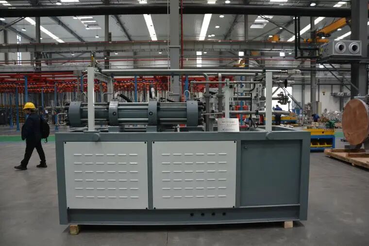 全釩液流電池電堆是儲(chǔ)能系統(tǒng)的“ 動(dòng)力心臟”。據(jù)車間工作人員介紹,杭氧研發(fā)的42kW全釩液流電池電堆能量效率大于82%,性能優(yōu)異且運(yùn)行穩(wěn)定,處于行業(yè)先進(jìn)水平,可應(yīng)用于新能源發(fā)電側(cè)儲(chǔ)能、電廠的調(diào)峰調(diào)頻等領(lǐng)域。氫液化透平膨脹機(jī)是獲取深低溫冷量的核心部件?!拔覀儎?chuàng)新研發(fā)的氫液化透平膨脹機(jī)采用多級串聯(lián)方式進(jìn)行布局,車間內(nèi)展示的為第一級膨脹機(jī),可在大于10萬rpm的超高轉(zhuǎn)速下穩(wěn)定運(yùn)行,并且能夠適應(yīng)高壓、25K深低溫的嚴(yán)苛氫氣環(huán)境,在確保機(jī)組零泄漏的同時(shí),能有效抑制熱傳導(dǎo)損失?!避囬g一位技術(shù)人員告訴記者。