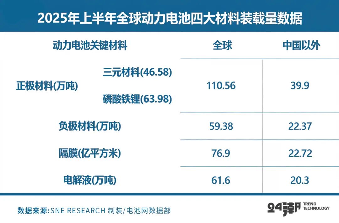 中游方面,2025年上半年,中國企業(yè)在四大材料領(lǐng)域均展現(xiàn)出壓制性優(yōu)勢,正極材料中,憑借在磷酸鐵鋰技術(shù)方面的主導(dǎo)力,進一步鞏固“中國中心”的格局;負極材料裝載量,中國企業(yè)占比高達95%,隔膜占比近90%,電解液也高達87.3%。