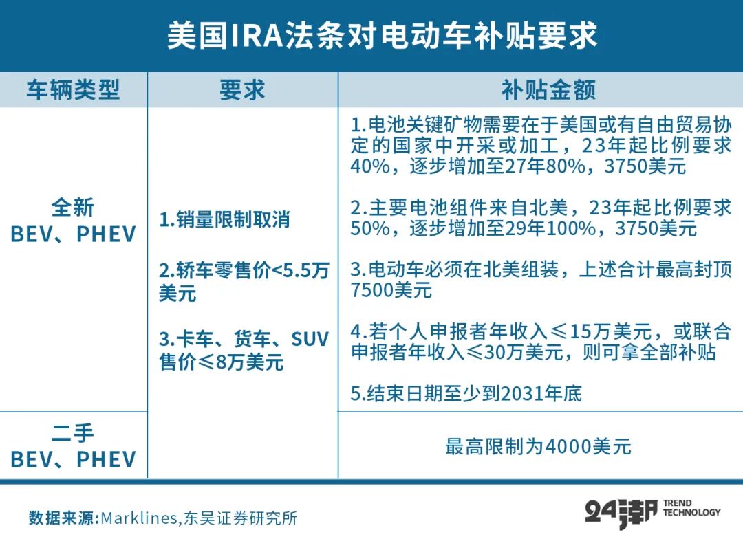 在新能源汽車領(lǐng)域,取消單一車企20萬輛銷量補貼上限,而中低收入人群購買(滿足法案要求)的電動車可最多拿到7500美元/輛的稅收抵免,還新增了二手車4000美元/輛的補貼。