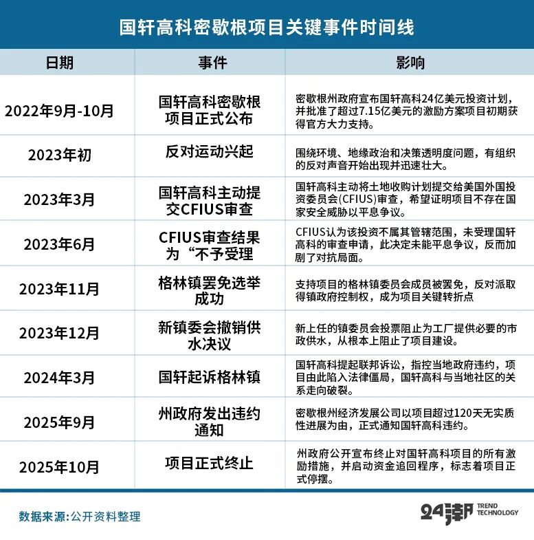 無獨有偶,2025年10月23日,據(jù)多家媒體報道,國軒高科因未能履行合同義務(wù),其位于美國密歇根州的電池材料工廠已被州政府視為放棄,終止所有激勵措施。