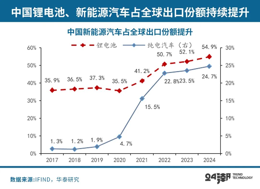 在新能源領(lǐng)域,中國的全球競爭地位尤為顯著,中國鋰電池出口占全球份額已由2017年的 35.9%上升至2024年的54.9%;純電動汽車出口份額從1.3%躍升至24.7%。