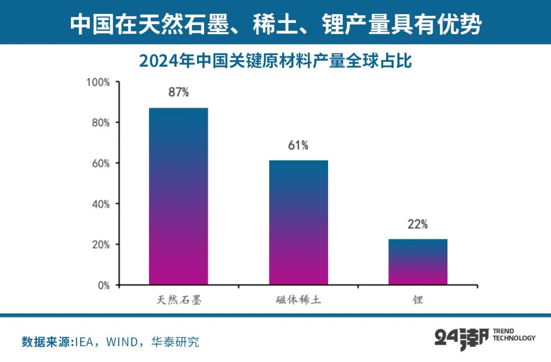 關(guān)鍵礦產(chǎn)供應(yīng)亦是如此,IEA發(fā)布的《全球關(guān)鍵礦產(chǎn)展望2025》顯示,截至2024年,全球原材料供應(yīng)上,中國天然石墨產(chǎn)量占全球87%,鋰礦產(chǎn)量占22%;而在中游加工環(huán)節(jié),中國的銅精煉產(chǎn)能占全球44%,鋰和鈷加工產(chǎn)能占70%-75%,稀土和電池級石墨精煉產(chǎn)能占更是超過90%。