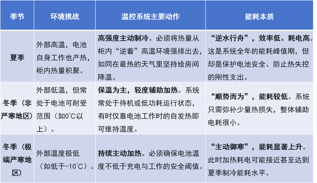 對于儲能柜而言,情況恰恰相反——在絕大多數(shù)氣候條件下,為其維持適宜溫度而產(chǎn)生的輔助能耗,夏天通常高于冬天。
