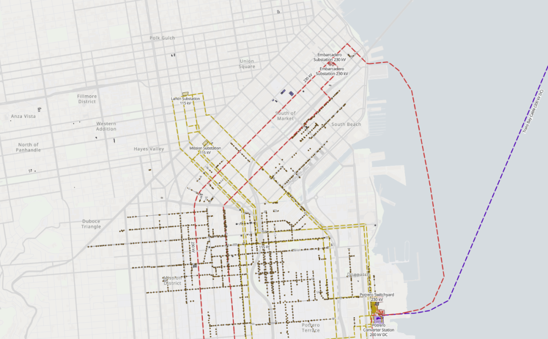 位于第 8 街和 Mission 街的 Mission 變電站,以及該區(qū)域龐大的 230kV 115kV 電纜供電系統(tǒng)。(金色為 115kV 地下電纜;紅色為 230kV;藍色為跨灣 ±200kV 直流)