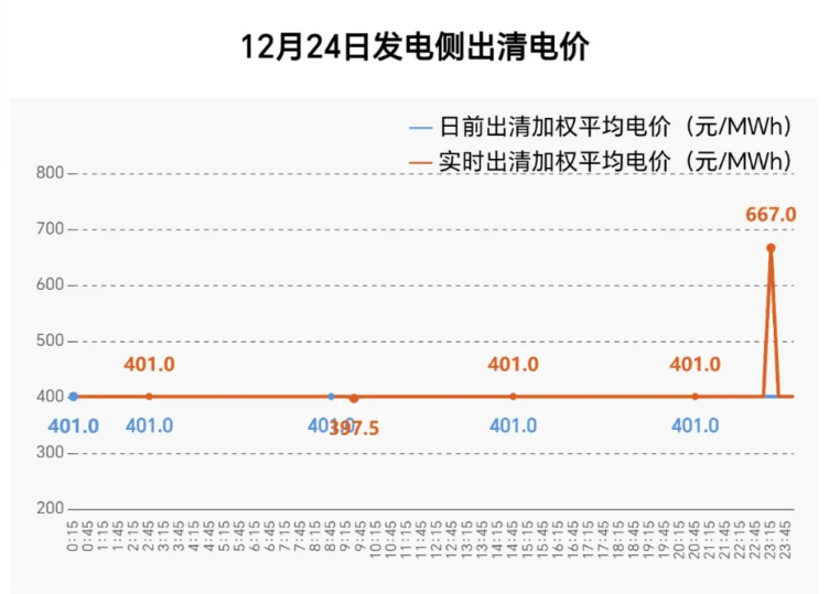 值得注意的是,12月24日安徽電力現(xiàn)貨市場(chǎng)日前統(tǒng)一結(jié)算點(diǎn)電價(jià)為一條直線,從1時(shí)到24時(shí)均為401元/兆瓦時(shí)。具體如下圖: