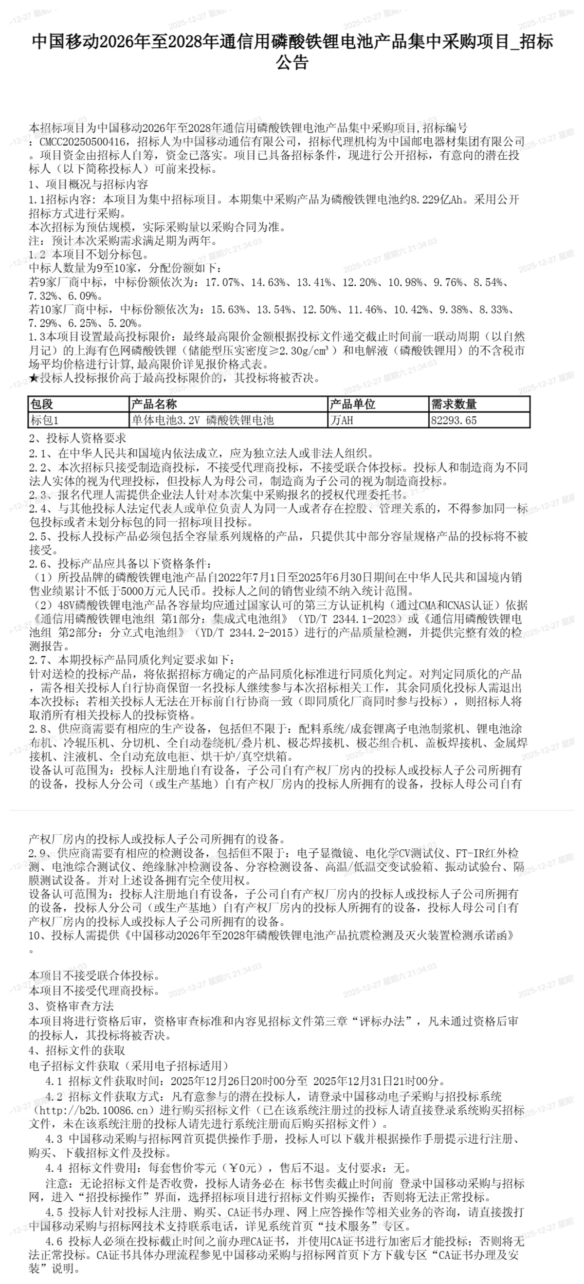 中國(guó)移動(dòng)2026年至2028年通信用磷酸鐵鋰電池產(chǎn)品集中采購(gòu)