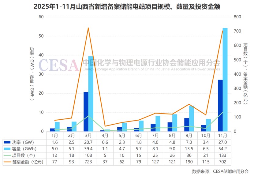 從全年來看,2025年1-11月,山西新增備案共計409個儲能電站項目,總規(guī)模高達75.7GW/152.4GWh,僅次于山東,位居全國第二,新增備案投資金額達2327億元,顯示出山西儲能市場的高景氣度與投資熱情。